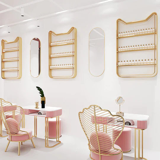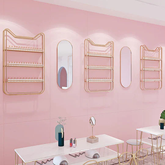 Uno scaffale elegante per valorizzare l’assortimento di smalti per le unghie. Le clienti possono ammirare e scegliere il colore che più gli piace per le proprie unghie.