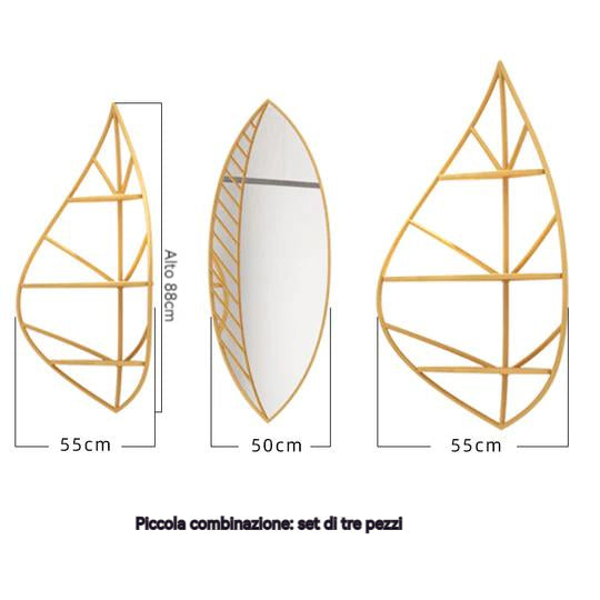 - Le due foglie formano due ripiani, ognuno con tre vani. Inoltre, lo scaffale è accompagnato da uno specchio a forma di foglia.