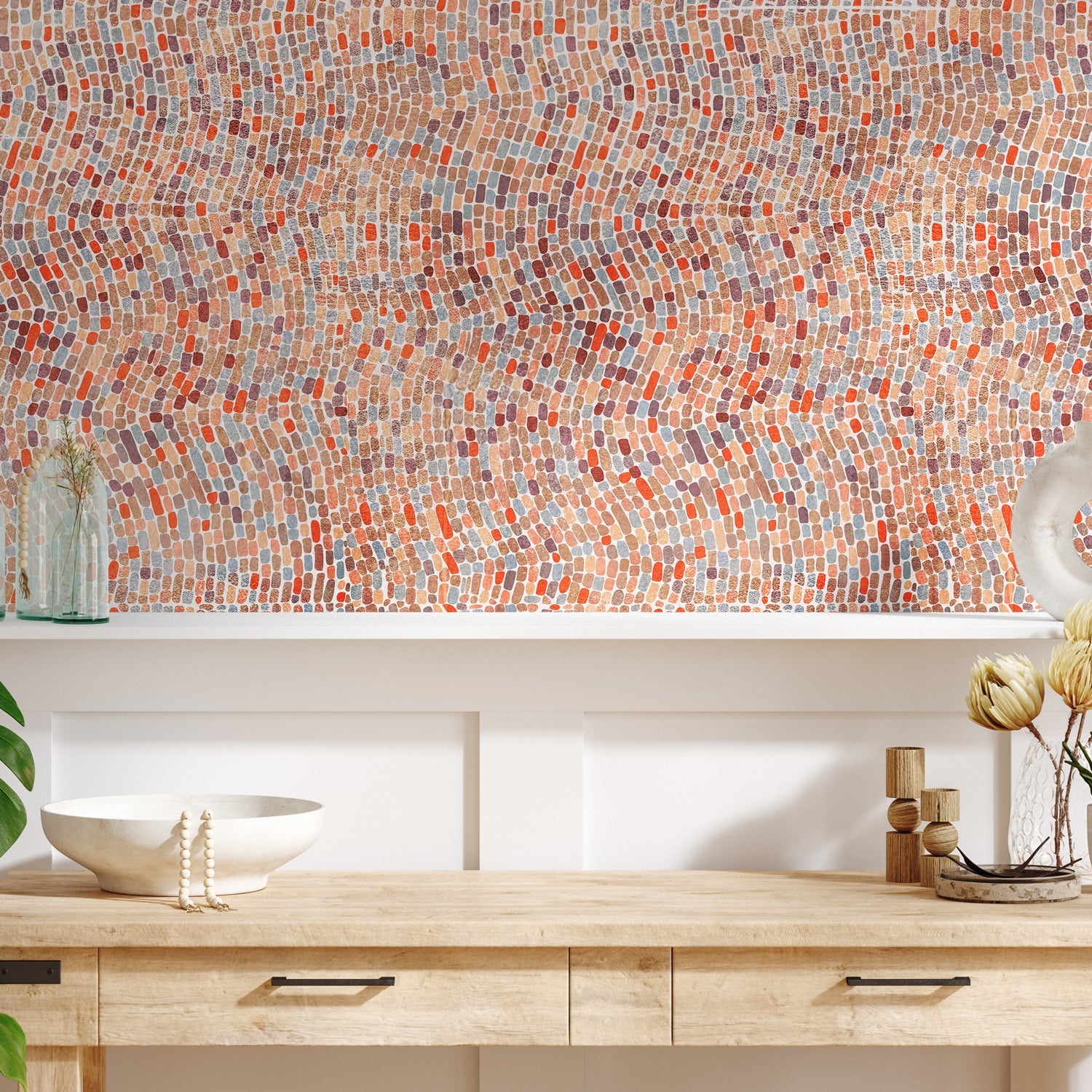 Porta il fascino delle antiche tessere musive sulle tue pareti con il murale "Vetro di Mare". Un design ispirato ai riflessi del vetro levigato dall’acqua, con sfumature calde e armoniose, perfetto per ambienti eleganti e accoglienti.